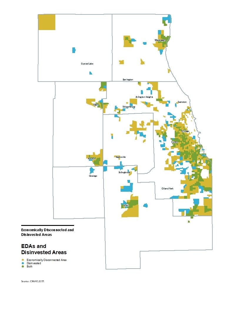 Description: CMAP has defined Economically Disconnected and Disinvested Areas within the region. Economically Disconnected Areas (EDAs) are areas that describe population-based estimates of concentrated low-income and minority status, whereas disinvested areas outline places with long-term declines in employment and other markers of commercial market weakness. Together, these communities experience a persistent, long-term lack of market investment, leading to declining property values, taxes, employment, and, frequently, population. Disinvestment often constrains the ability of any individual community to respond effectively to these losses, and high tax rates and low market potential limit private investment. Chicago Metropolitan Agency for Planning, 2018